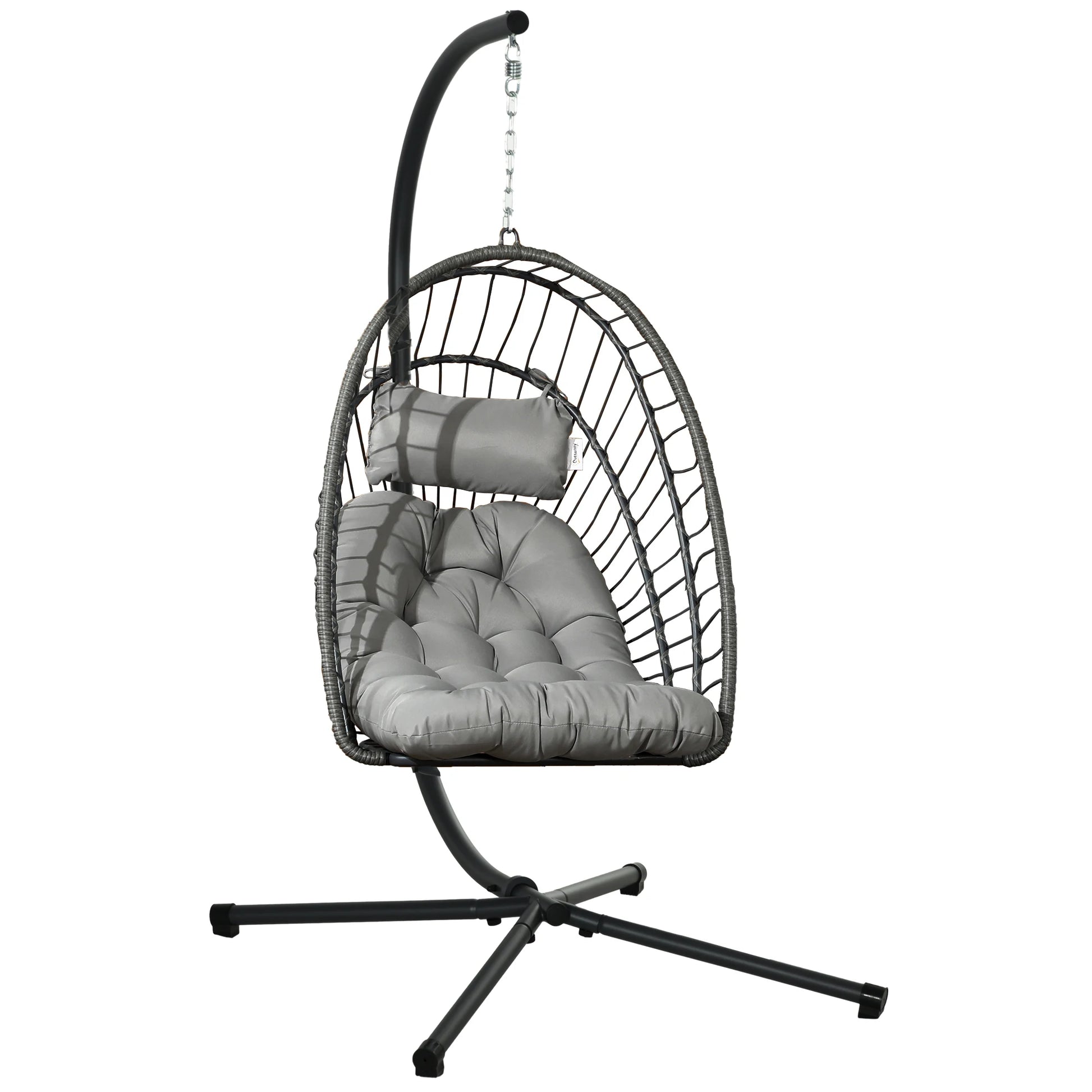 Rattan Hanging Swing Chair with Cushions and Stand - Light Grey